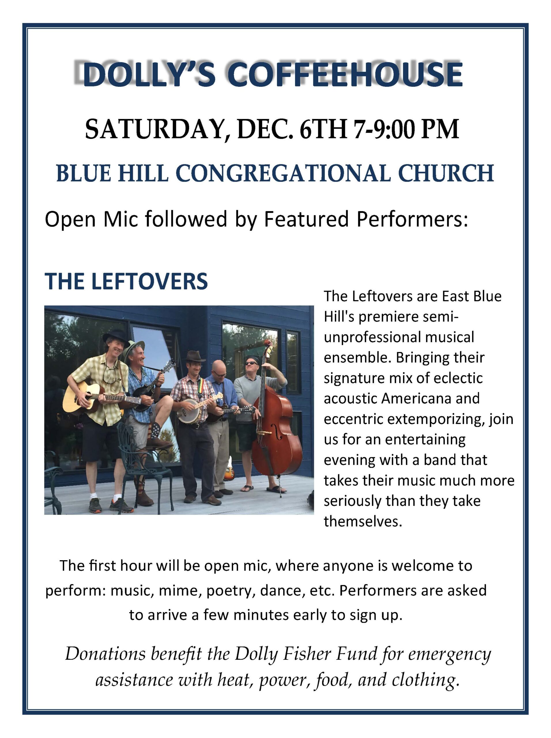 After 15 years of performing throughout the Blue Hill Peninsula, The Leftovers are finally ready to bring their signature mix of eclectic acoustic Americana and eccentric extemporizing to Dolly’s Coffeehouse as featured artists. The Leftovers are East Blue Hill’s premiere semi-unprofessional musical ensemble. Join us on Saturday, December 6th 7:00-9:00pm, for an entertaining evening with a band that takes their music much more seriously than they take themselves.